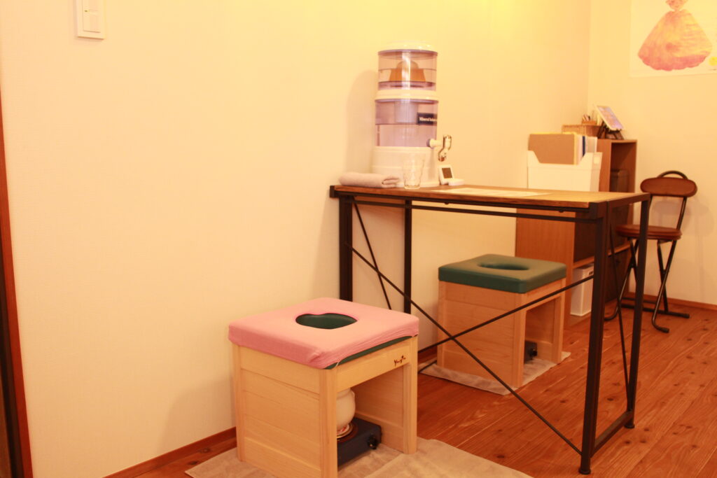 椅子の下でよもぎを入れた土鍋を蒸し、お洋服を脱いで頂き、顔だけ出せるマントを羽織ってその椅子に座り、身体を温めていきます。女性のデリケートゾーンは経皮吸収率が高いため、熱しても土鍋、水、椅子などから有害物質が出ないこだわりぬいた製品を使用してありますので、当店では安心して受けて頂くことが出来ます。