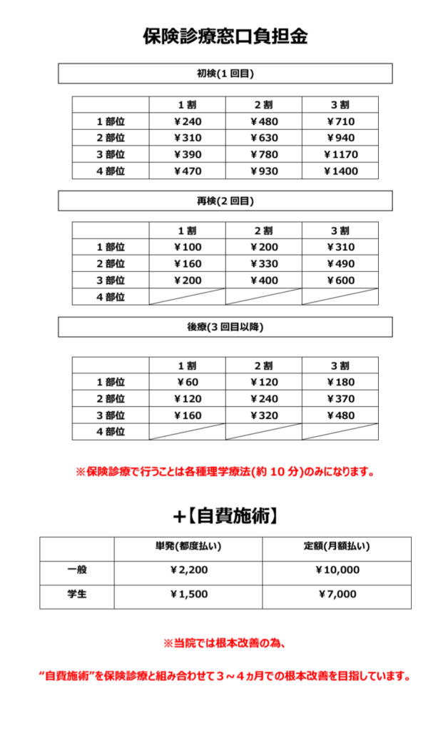 保険施術の料金は負担割合や来院回数などでも変わります。料金表は下記の通りになります。